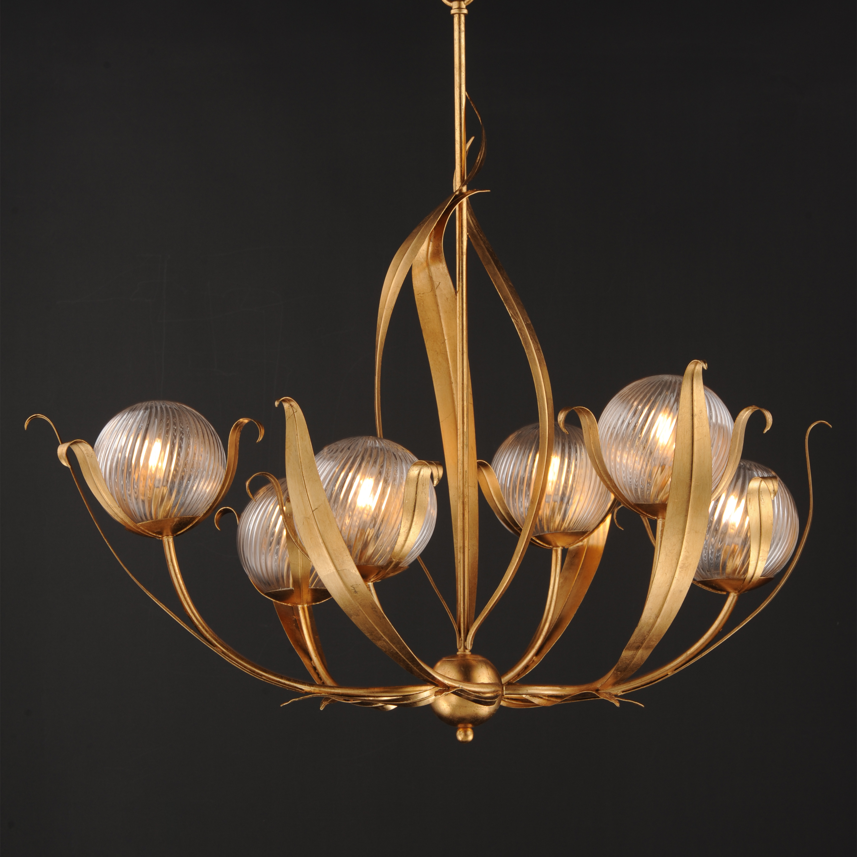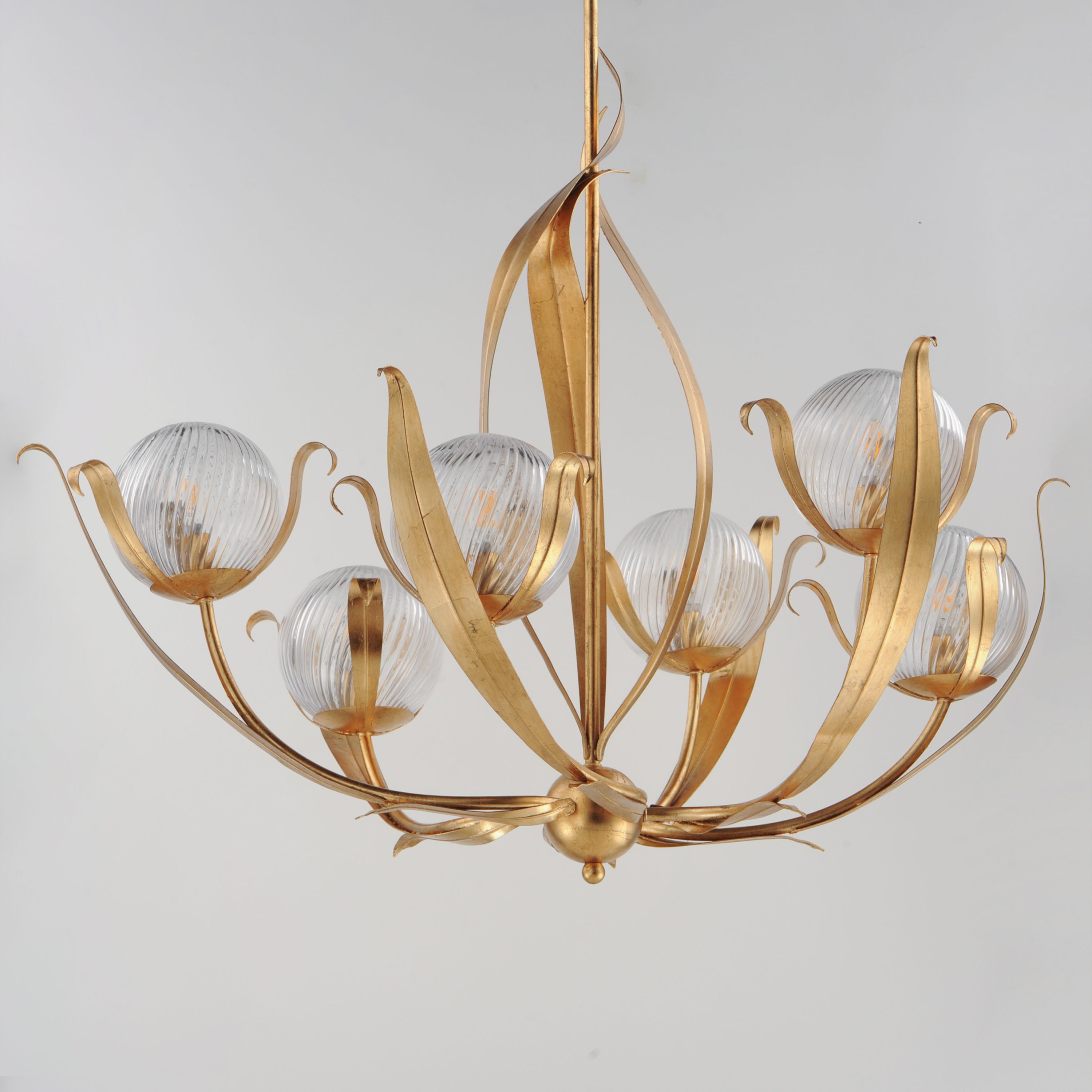 Celebrating the beauty of nature through sculptural, biophilic design. Delicate leafy forms rise in graceful motion, supporting spiraling clear ribbed glass globes that encase the light in luminous movement. Inspired by the romantic swirl of Italian glassworks, each piece feels both organic and artful. Finished in hand-applied gold leaf, Firenze brings warmth, texture, and botanical elegance to chandeliers, pendants, semi-flush mounts, and sconces, transforming spaces with a graceful balance of artistry and light.