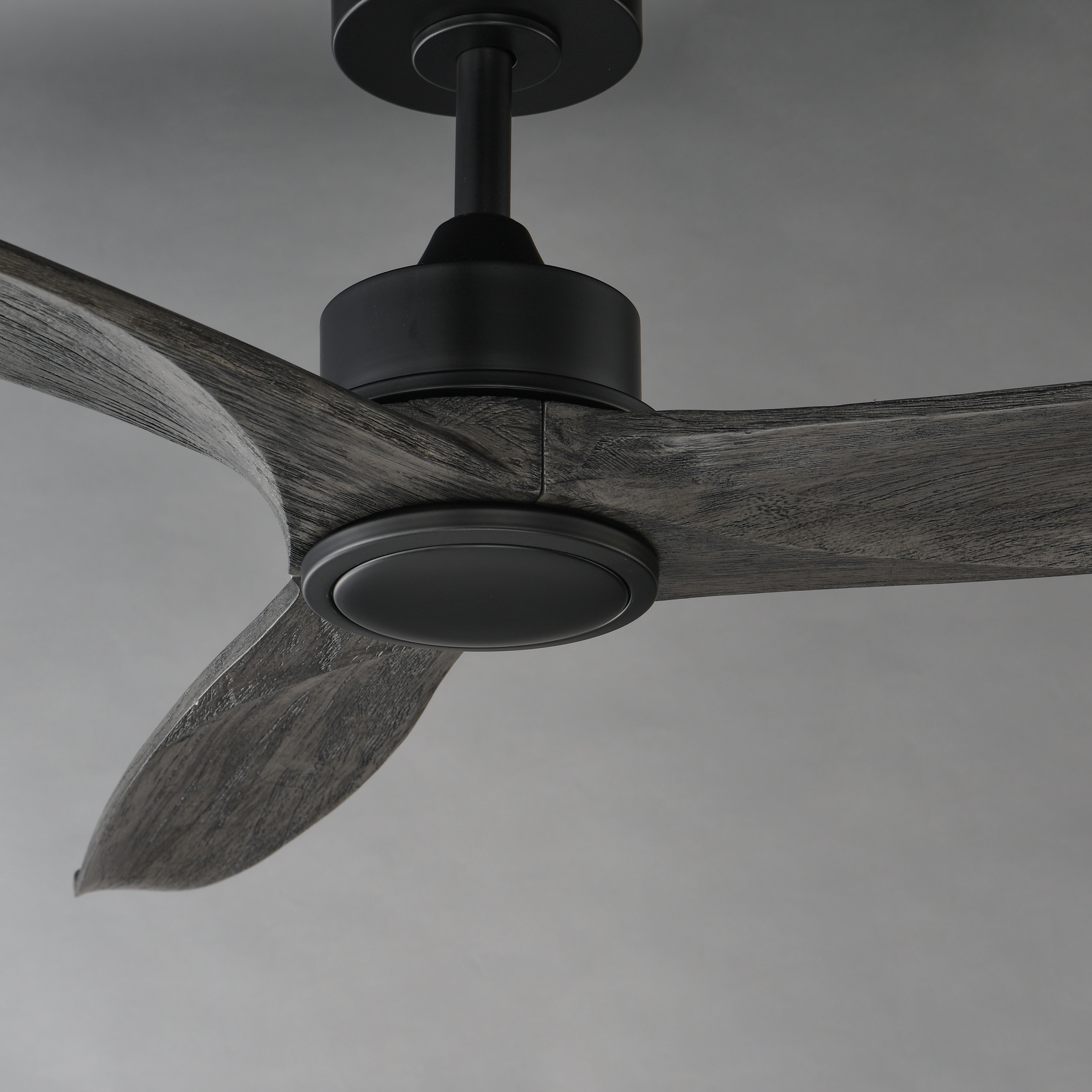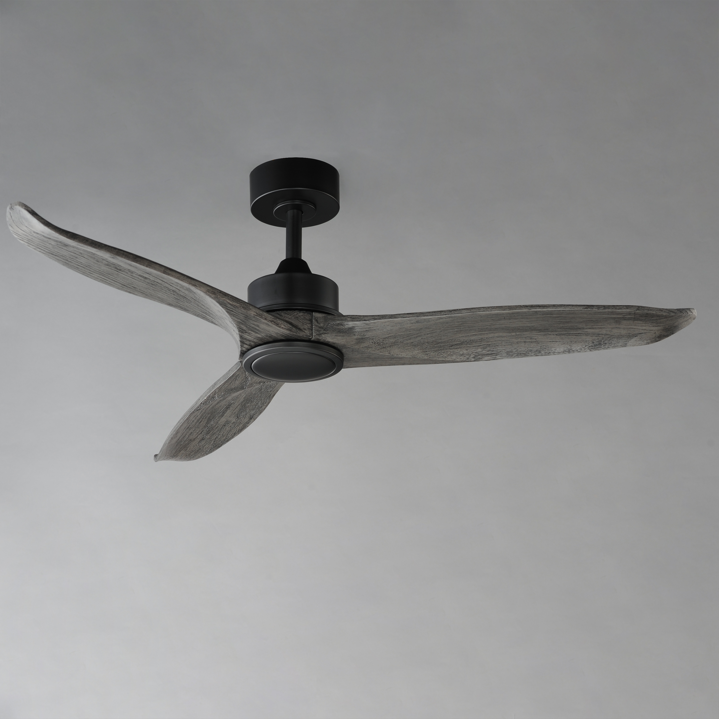Solid Wood blades curve as they rotate around a center housing with LED light kit included. An additional cover plate is included if the light kit is not used. Select from stylish finish combinations including Natural Aged Brass with White Wood, Satin Nickel with Greywood, Black with Walnut wood, or Charcoal Bronze with Distressed Wood.